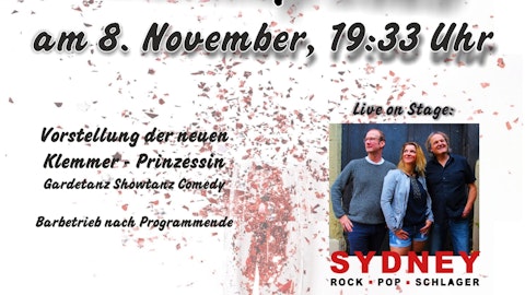 Die Klemmer starten in die 5. Jahreszeit traditionell mit dem Faschings WarmUp in der Sithalle Gräfenhausen mit einem kurzweiligen Programm mit Garde- und Showtanz Musik und Comedy. Höhepunkt ist die Proklamation der neuen Klemmerprinzessin. Nach Programmende spielt die Band "Sydney" zum Tanz auf und die Klemmerbar öfnet ihre Tore. Für Speis und Trank ist bestens gesorgt.